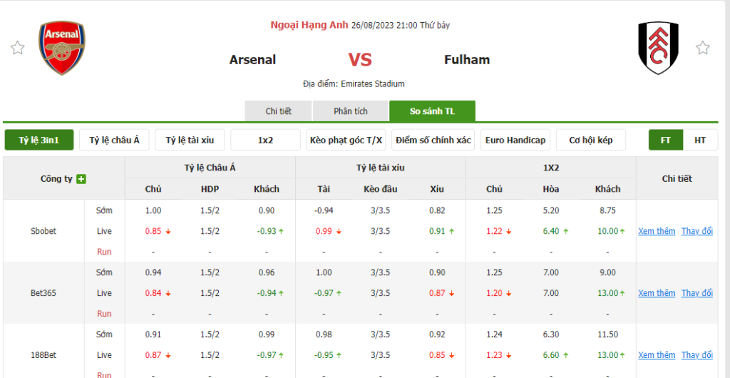 Tỷ lệ kèo trận đấu Arsenal vs Fulham
