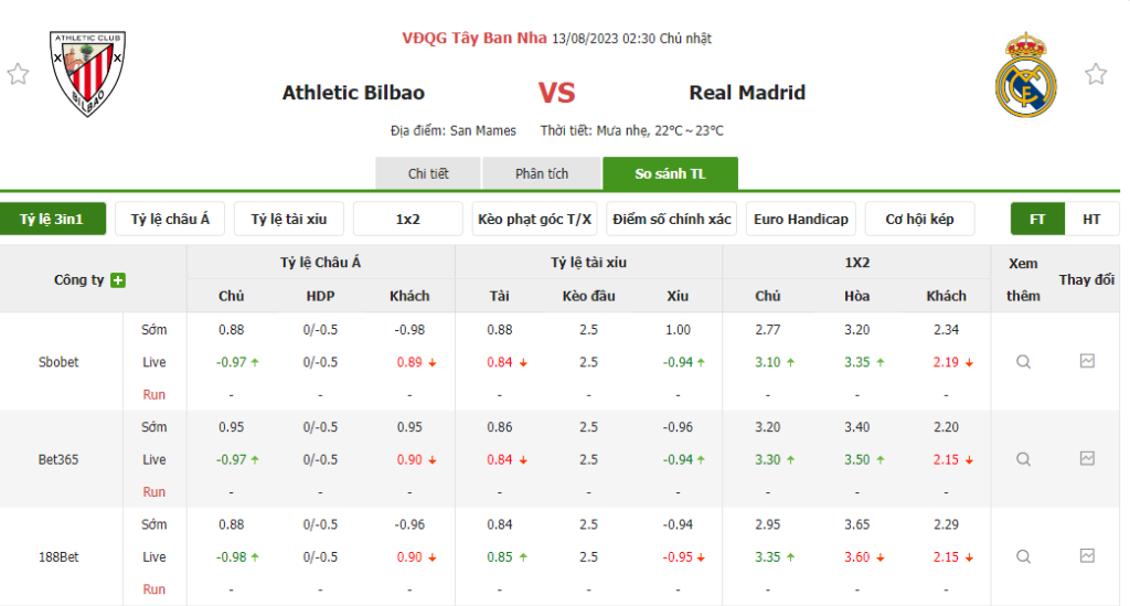 Tỷ lệ kèo trận đấu Athletic Bilbao vs Real Madrid