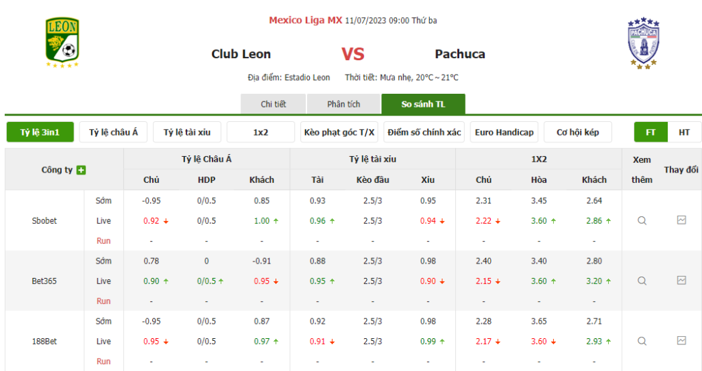 Tỷ lệ kèo trận đấu Club Leon vs Pachuca