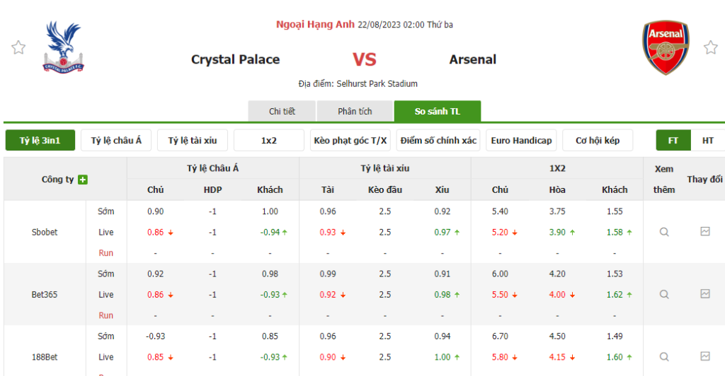 Tỷ lệ kèo trận đấu Crystal Palace vs Arsenal