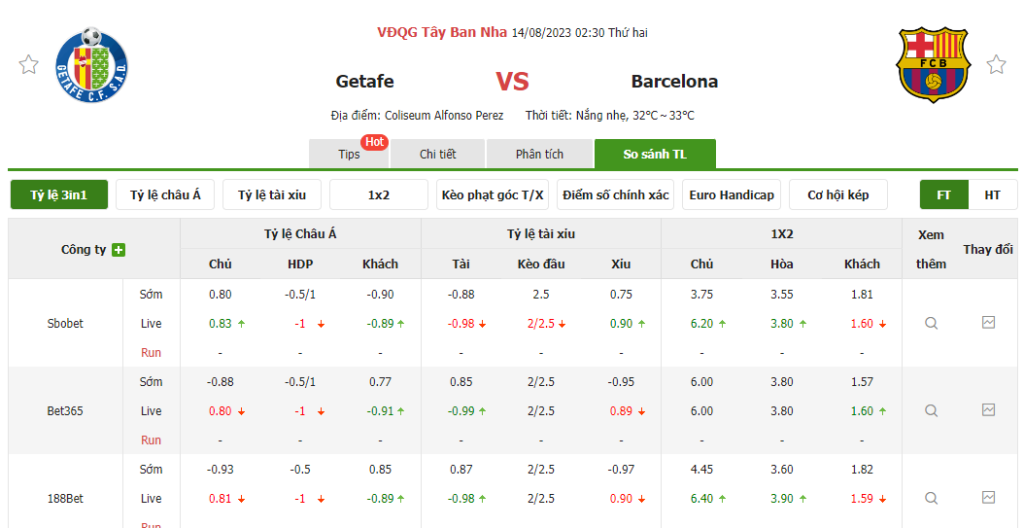 Tỷ lệ kèo trận đấu Getafe vs Barcelona
