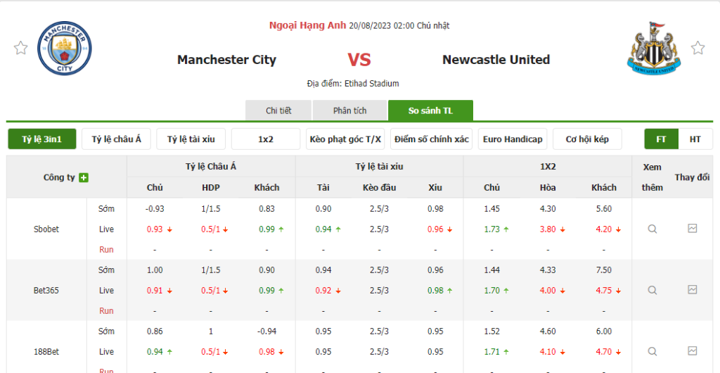 Tỷ lệ kèo trận đấu Man City vs Newcastle