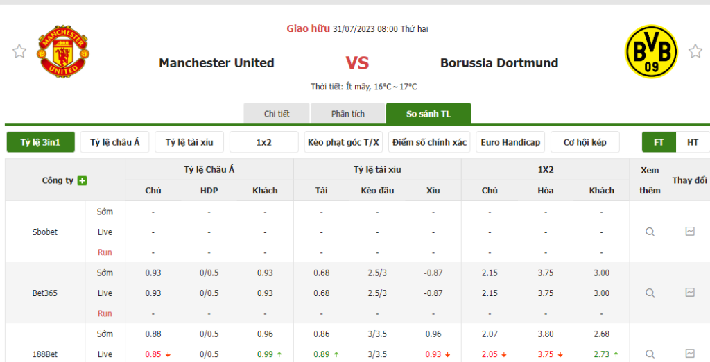 Tỷ lệ kèo trận đấu Man United vs Borussia Dortmund
