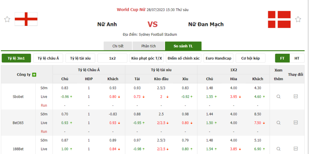 Tỷ lệ kèo trận đấu Nữ Anh vs Nữ Đan Mạch