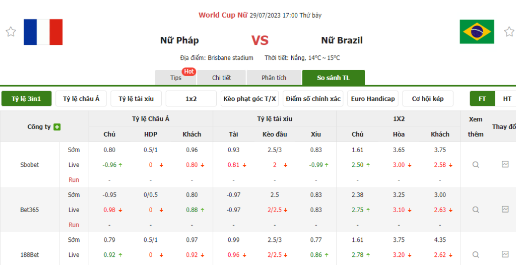 Tỷ lệ kèo trận đấu Nữ Pháp vs Nữ Brazil