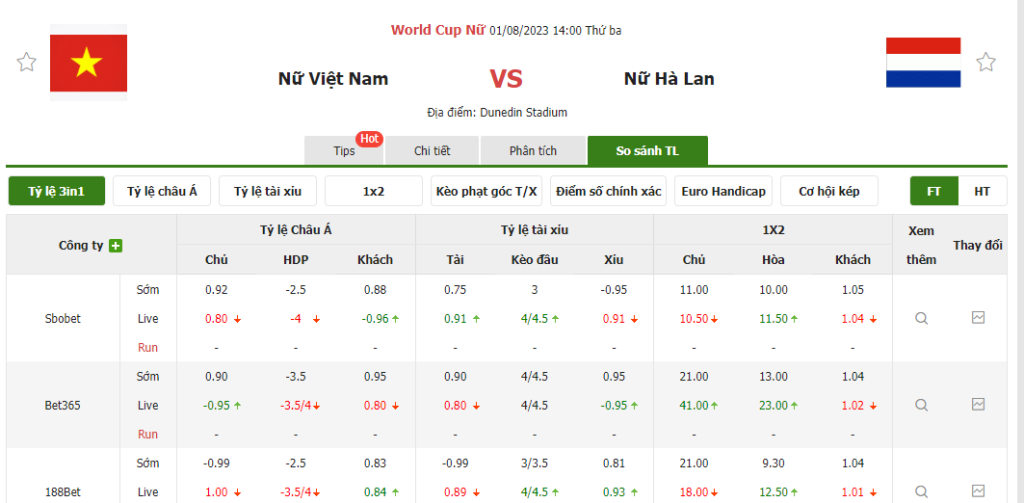 Tỷ lệ kèo trận đấu Nữ Việt Nam vs Nữ Hà Lan