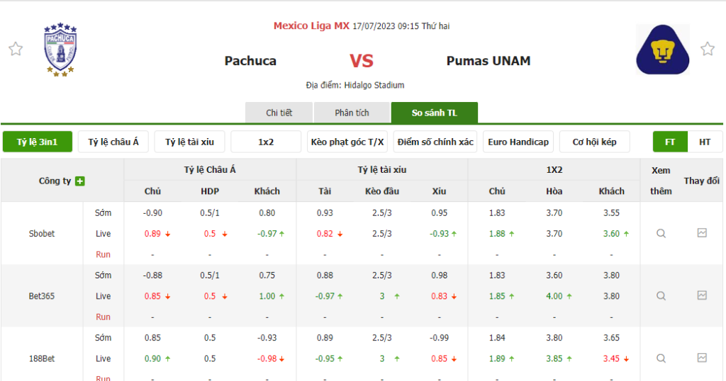 Tỷ lệ kèo trận đấu Pachuca vs Pumas UNAM