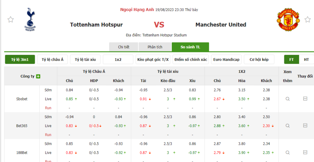 Tỷ lệ kèo trận đấu Tottenham vs Man United